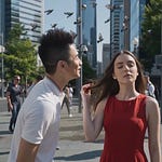 Visuals: Modern barbershop setting with dark slatted walls, neon ‘SIFUYIK’ sign, square overhead lighting. A large lion with a full mane sits in a barber chair wearing a pinstriped cape. A tabby cat barber in a black t-shirt with ‘SIFUYIK’ uses red clippers and a hairdryer on the lion’s head. The lion’s mane is dramatically shortened and styled into a tall, dramatic pompadour with a side part. Clumps of fur fall during the haircut.